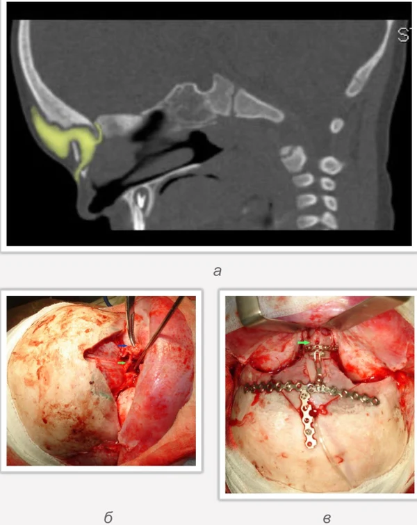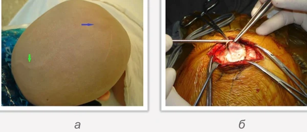 Иссечение дермальных синусов, дермоидных кист и перикраниальных синусовРазличают краниальный и спинальный дермальный синусы. Дермальный синус может заканчиваться как в мягких тканях, так и проникать в полость черепа или позвоночного канала. В последних случаях имеется высокий риск развития менингита. Лечение только хирургическое, проводится полное иссечение синуса. При распространении синуса до твердой мозговой оболочки свищ иссекается вместе с окружающим участком твердой мозговой оболочки. Дефект твердой мозговой оболочки герметично ушивается.
